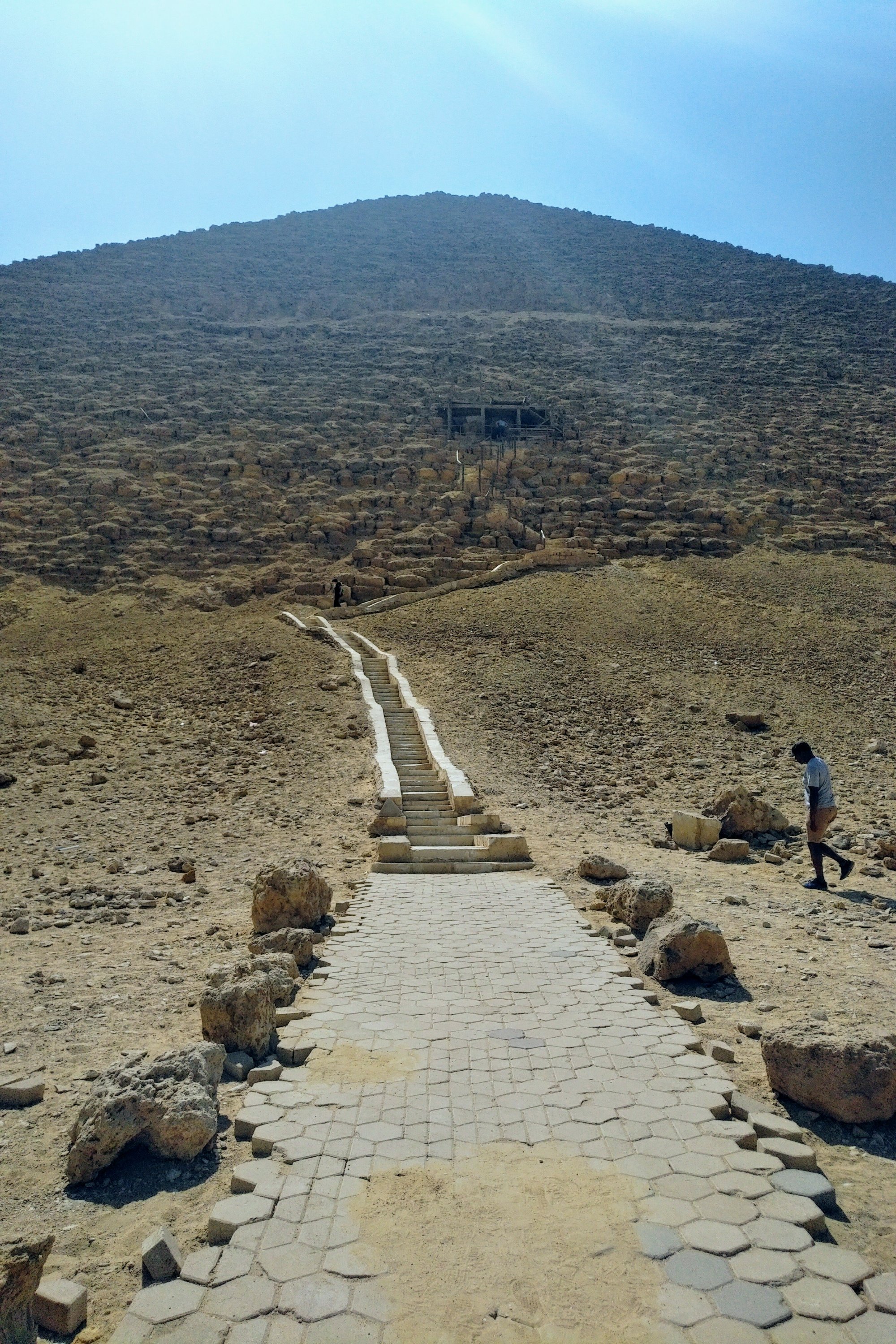One of the pyramids I visited was called the Red Pyramid. This is one of the few pyramids that you can go into….if you can make it to the opening. The “door” to the pyramid is 100 feet up very steep stairs. There are no railings and each step is at least 12 inches high so your thighs get an incredible workout. Once you make it to the entrance after climbing in 35C heat, you are handed a flashlight as you duck into a hunch position as you descend over 200 feet into the bowels of the pyramid. To say this was a challenge is an understatement. It is dark and damp and kinda spooky but once inside the burial chamber you can stand up. There is a strong smell of ammonia which is probably due to bats and what they excrete. It takes maybe ten minutes to see the chamber….and then you have to ascend the 200 feet the same way you got down. By the time I reached the top of the tunnel I thought I would faint. I sat on a ledge trying to gather my strength and wits before starting the 100 foot climb down the steep steps. When I finally reached the bottom I was drenched in sweat and could no longer feel my legs. But I did it. I conquered a grand task and felt very satisfied with myself.